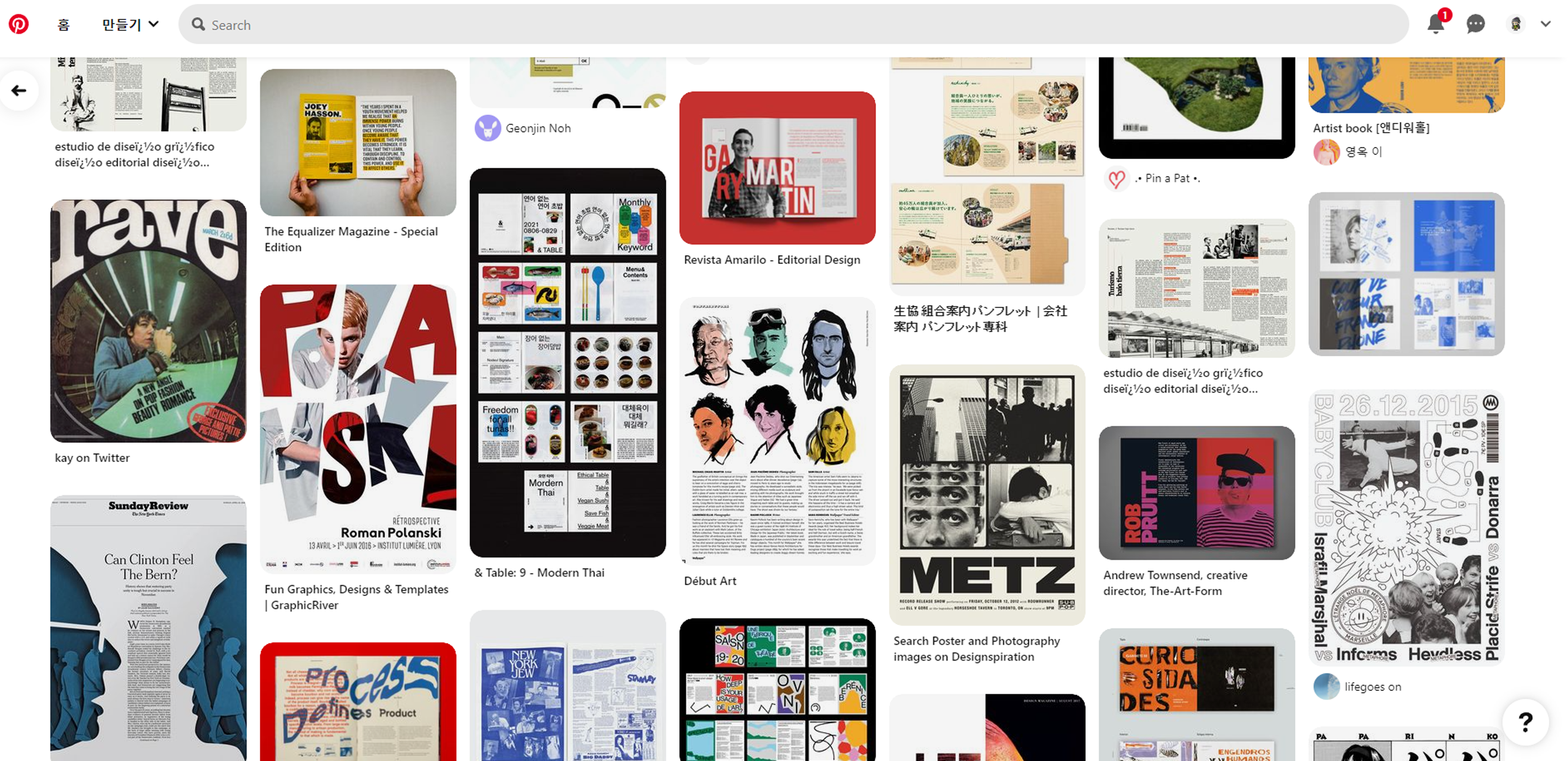 현시점에서 핀터레스트를 빼놓고는 '트렌드'를 논하기 어려울 정도입니다. 가장 핫한 사이트이자 어플리케이션으로, UI 가 깔끔하고 쉽게 이미지를 공유하고 공유를 받을 수 있다는 점. 새로고침을 할 때마다 나의 관심사에 맞게 바뀐다는 점. 원하는 카테고리에 맞게 분류하여 이미지들을 모아 한눈에 파악할 수 있다는 점 등의 장점이 있습니다. 내가 원하는 디자인을 빠르게 파악해보시길 바랍니다.
