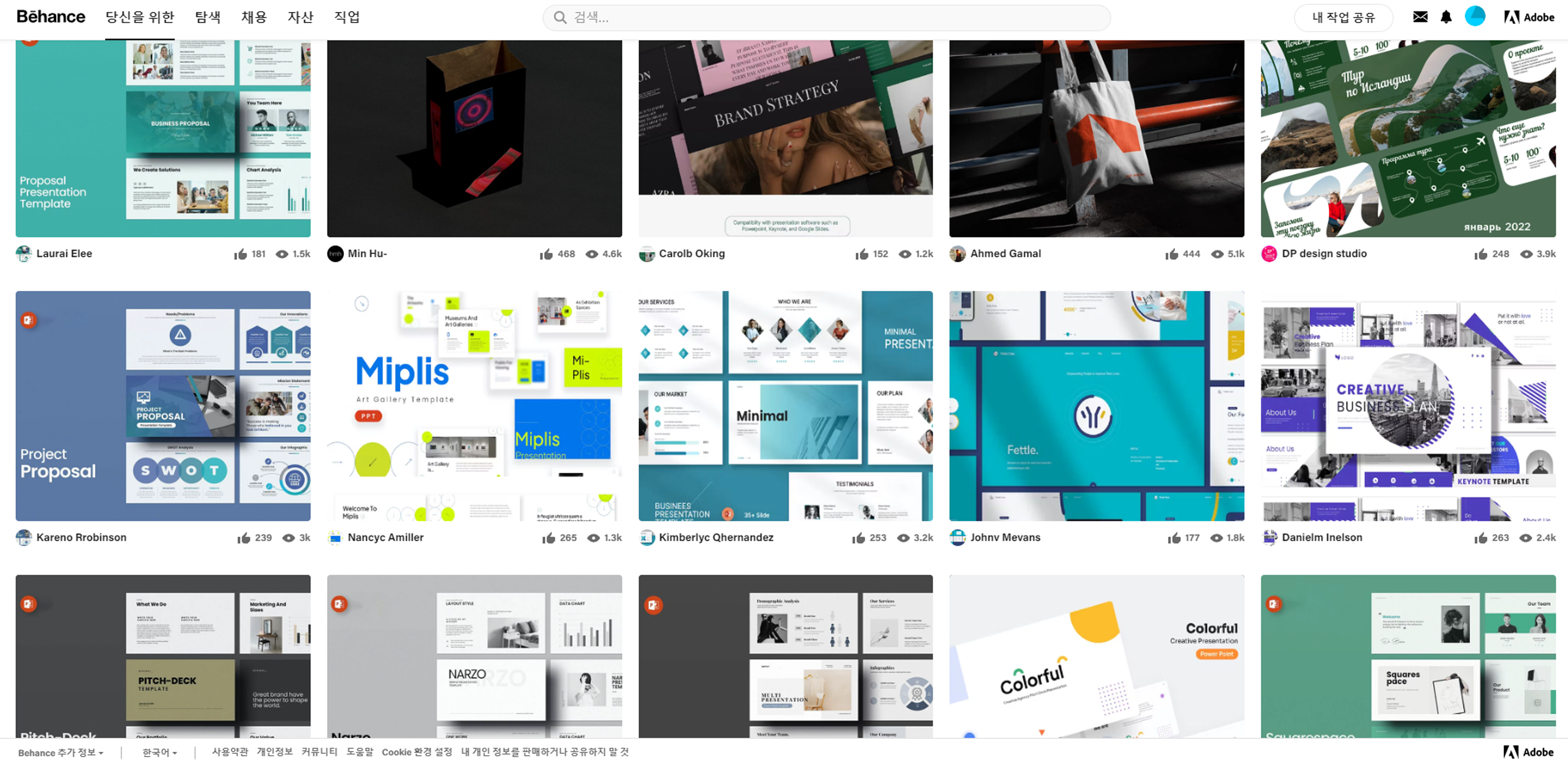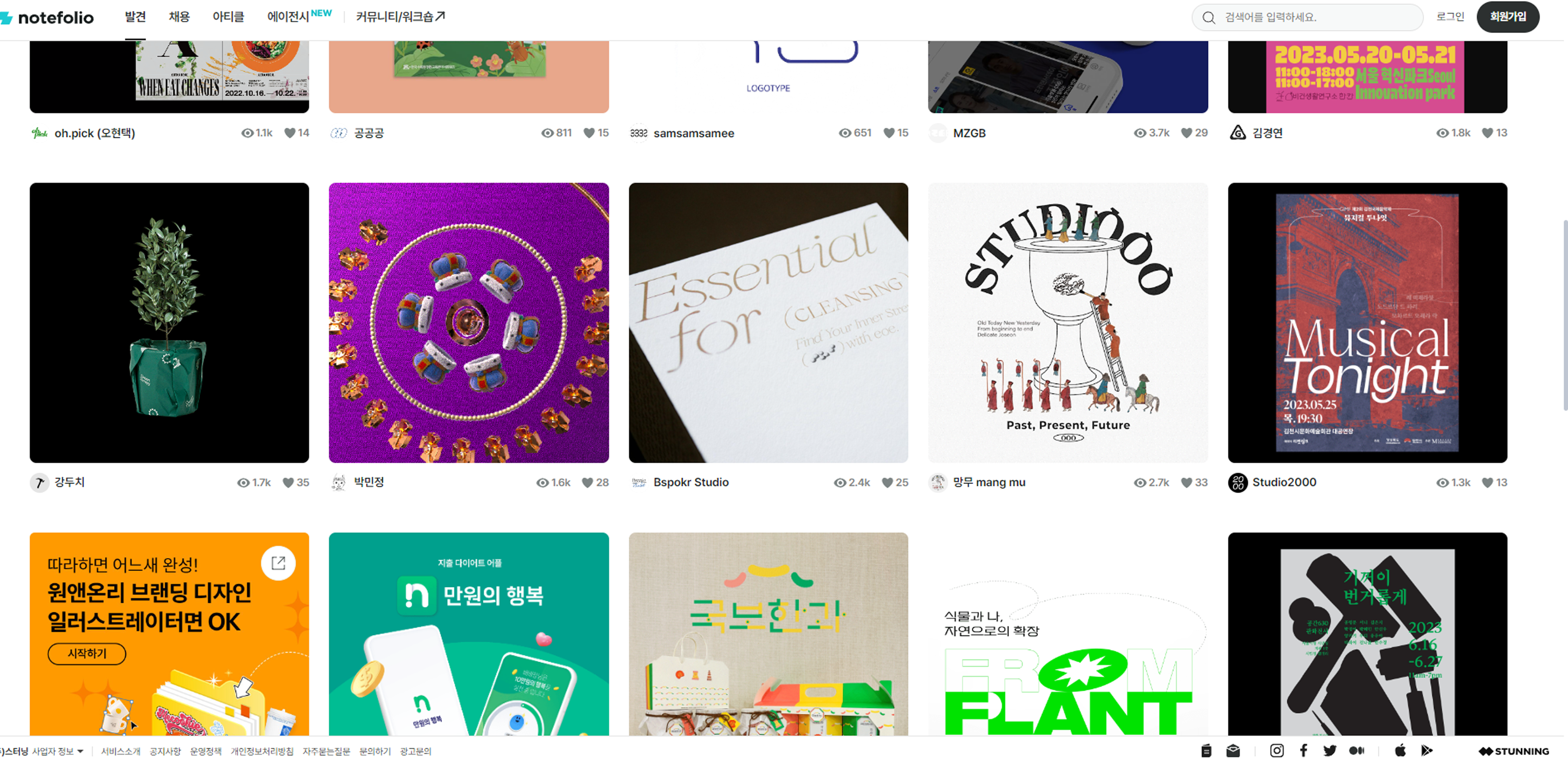 디자인을 바로 확인하는 곳으로는 적합하지 않다고 느낄 수 있지만, 아닙니다.현시점에서 디자인 전문 프리랜서들이 어떠한 동향으로 디자인을 작업하는지 공유하는 카테고리가 있기 때문인데요,상위 카테고리 중 '포트폴리오'를 클릭, 추천 포트폴리오와 전체 탐색 중 '전체 탐색'을 누르고 원하는 카테고리의 디자인을 선택하면금새 해당 디자인의 흐름을 파악할 수 있습니다. 노트폴리오와 마찬가지로 국내 디자이너들의 동향을 파악하고 싶다면 해당 방법을 이용해보시길 추천드립니다.