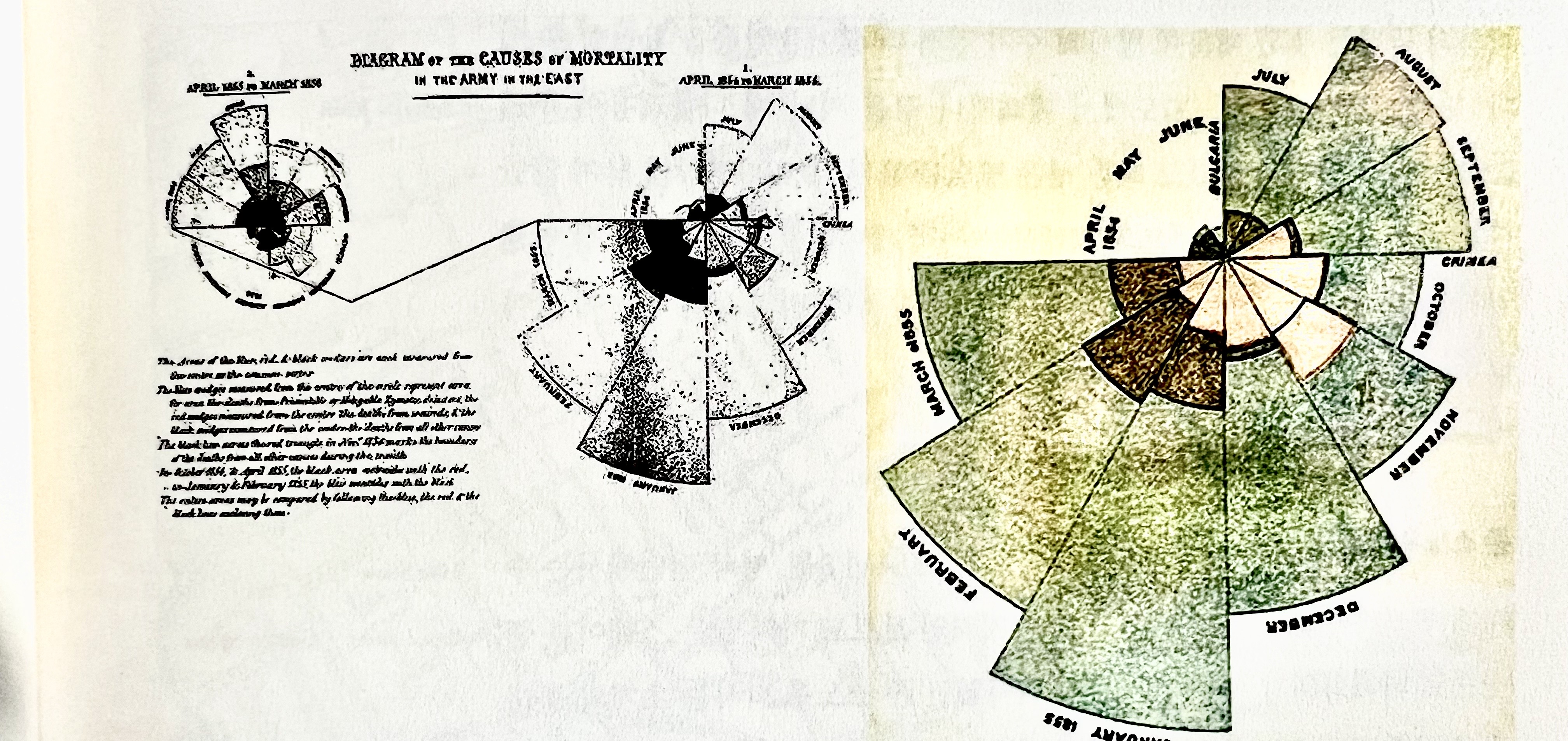 전쟁 중인 1855년에는 영국 지역 야전 병원의 사망자 수가 최고조로 증가하였다. 전염병으로 사망한 군인의 수가 2,761명, 외상에 의한 사망은 83명, 그 밖의 다른 이유로 사망한 수는 324명으로 총 3,168명의 군인이 전사하기에 이르렀다. 군대의 한 달 병력은 32,393명으로 나이팅게일은 이 데이터를 보고 전염병에 의한 사망자 수가 10,000명 중 1,023명이라고 집계했다. 군대가 자주 교체되지 않은 상태에서 이러한 사망률이 계속된다면 모든 영국군 병사가 크림 전쟁에서 사망하리라는 예견도 할 수 있었다. 나이팅게일은 시각적 통계 그래프를 통해 사망원인을 분ㅅ거하고 이를 개선하려고 했다.