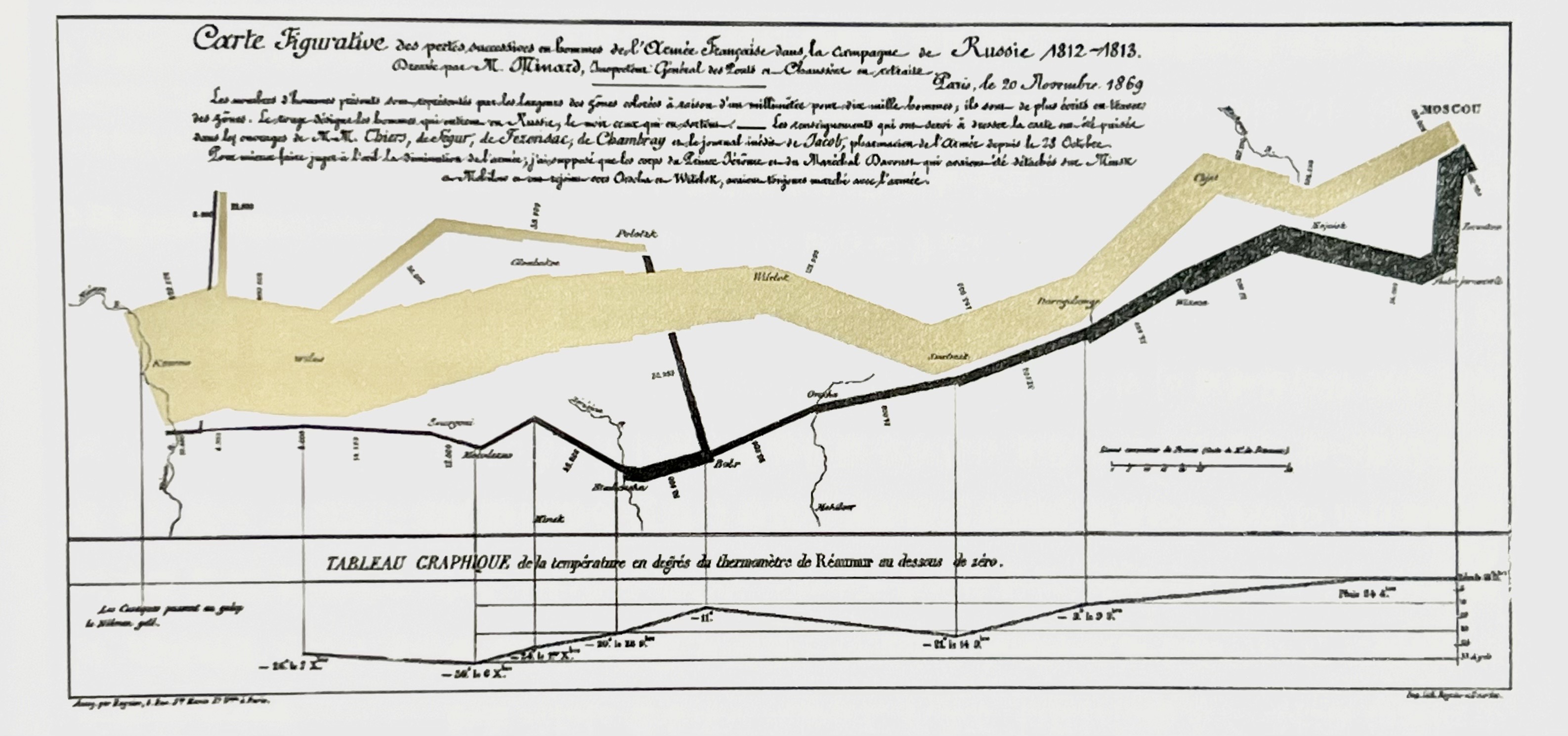 다이어그램에서 맨 왼쪽은 출발 지점이고 오른쪽 끝이 목표 지점인 모스크바이다. 진격하는 병사의 숫자 규모는 베이지색으로 표현된 불규칙한 그래프인데, 처음 출발할 때는 422,000명이었으나 모스크바에 도달했을 때는 100,000명으로 줄었음을 나타낸다. 오른쪽에서 왼쪽으로 향하는 검은색 선은 후퇴 경로를 의미하며, 하단에는 퇴각 시 기온을 함께 표시하여 영하 30도 이하의 극심한 추위 때문에 병사의 수가 점점 더 줄어들었음을 확인할 수 있다. 다이어그램은 영하 20도에서 베레지나 강을 지날 때 나폴레옹이 무려 22,000명의 군사를 잃었고 최종 생존 병력은 불과 10,000명밖에 남지 않았다는 것을 보여 준다. 미나르의 그래프는 여러 데이터를 복합적으로 잘 연계하여 전쟁 당시의 병사 수와 기온, 진격 방향과 거리, 지역 등을 한눈에 알아볼 수 있게 했다.